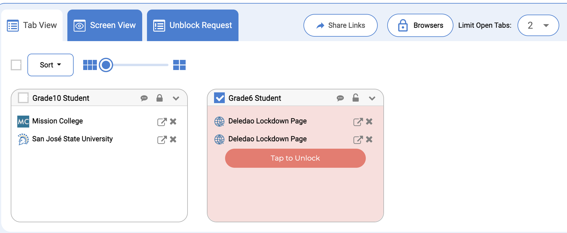 - Open Tab - Open the student's tab in your browser. The student's tab will open in a new tab on the instructor's browser.