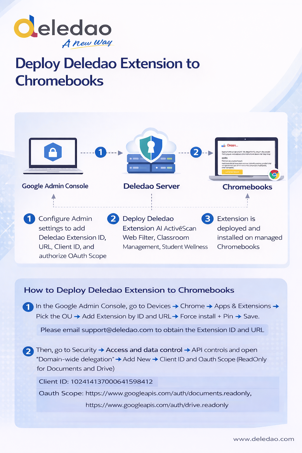 - Please email support@deledao.com to obtain the Extension ID and URL required to activate Deledao's filters. We will get back to you shortly after confirming your school's registration ID with Deledao.