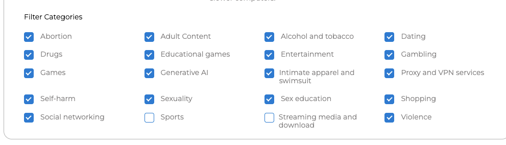 - When creating a template you can choose what categories to be filtered and the ability to add URL's to the blocked or allowed list.